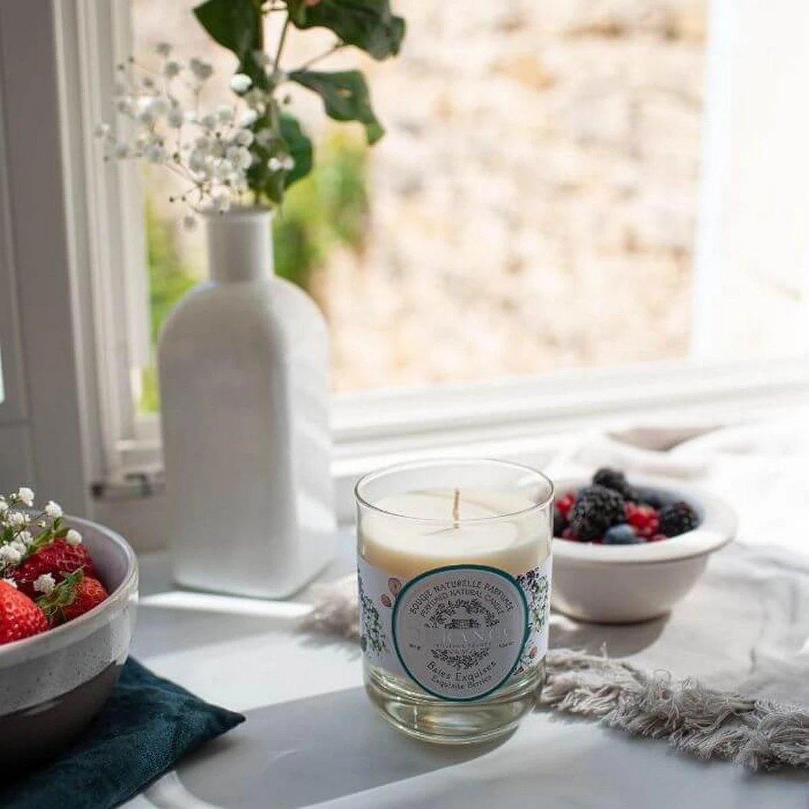 Une bougie parfumée naturelle au parfum délicieux et élégant de fruits rouges, faite de cire naturelle.